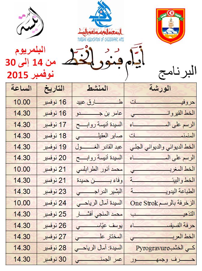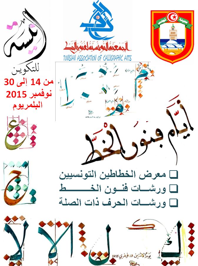 L'Association Tunisienne des Arts Calligraphiques organise les Journées des Arts Calligraphiques en partenariat avec le Centre Anissa Formation des Métiers de l'Artisanat du 14 au 30 Novembre 2015 à la Galerie YAHYA Centre Commercial PALMARIUM- TUNIS