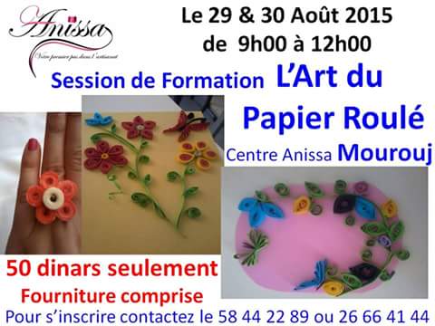 Le Centre Anissa MOUROUJ organisé le 29 & 30 août 2015 de 9h00 à 12h00 une session de formation sur l'Art du Papier Roulé frais de participation 50 dinars fourniture comprise pour s'inscrire contactez la responsable formation au 58442289 ou 26664144