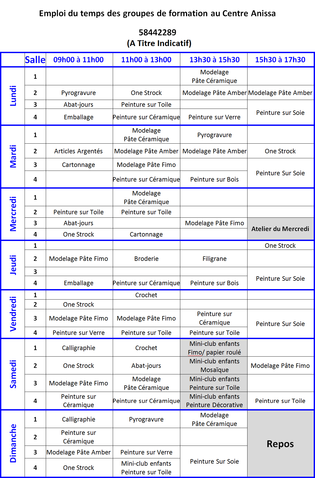 Le Centre Anissa MOUROUJ organisé chaque samedi aprés midi des Mini Club pour enfants dans les spécialités peinture à l'Huile, artisanat, Mosaique, modelage de la pate FIMO, l'Art du papier Roulé pour s'inscrire contactez la responsable formation au 58442289 ou 26664144